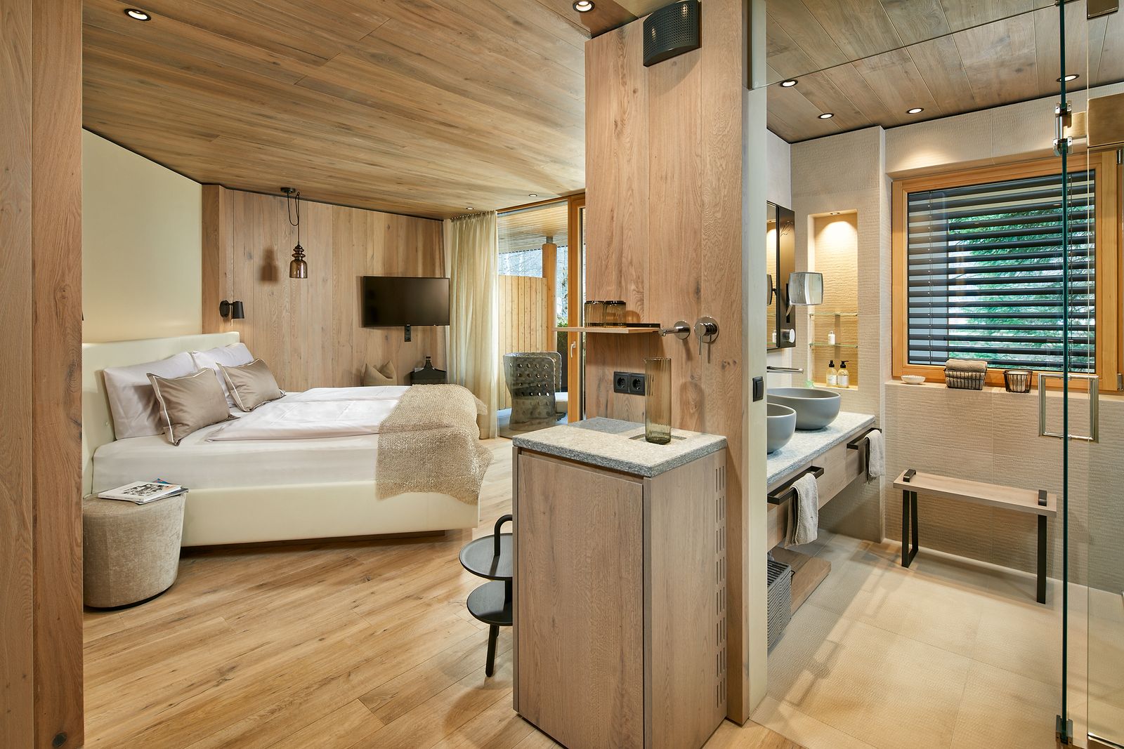 südseitige Loggia mit kuscheligen Relaxmöbeln und Bergblick, gemütlicher Wohnbereich mit Schreibtisch, hochwertiges VI-Spring Boxspringbett, Badezimmer mit Doppelwaschbecken und Dusche, abgetrenntes GEBERIT WC, Quellwasserbrunnen, Teebar, Minibar, Nespresso-Kaffeemaschine
